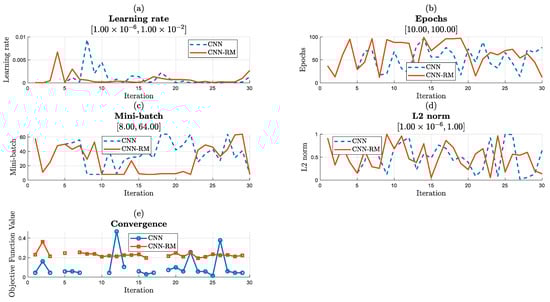 Figure 10 illustrates the evolution of key parameters, including the learning rate (Figure 10a), epochs (Figure 10b), mini-batch size (Figure 10c), and L2 norm (Figure 10d), across optimization iterations for both CNN and CNN-RM, along with their convergence trends (Figure 10e). Throughout all hyperparameters, CNN-RM exhibits smoother transitions and fewer fluctuations compared to CNN, indicating a more stable optimization process. The convergence plot in Figure 10e further reinforces this observation, as CNN-RM reaches a stable minimum with less fluctuation, suggesting a more effective parameter correction and update mechanism. This smoother behavior highlights CNN-RM’s advantage in achieving better optimization stability and efficiency compared to CNN.