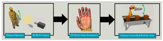 Even though the majority of gesture control systems rely on wearable devices [34,35], there exist some non-wearable-based methods that utilize AI and depth camera sensors. However, they do not consider the orientation of the user’s hand, thus failing to provide precise gripper control [36,37]. To address this gap, we propose a complete system that combines the above. Our system identifies the pose and the hand gestures of an operator, using state-of-the-art machine learning (ML) techniques based on an RGB-D camera, and directly translates them to control commands of a robotic arm, targeting small assembly lines (Figure 1). Our novelties include the following: