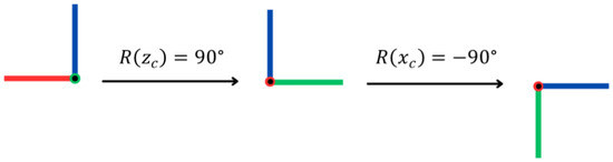 To convert hand coordinates to chest coordinates, the transformation matrix is required, which is constant. The camera’s coordinate frame is shifted d units away from the reference frame on the human’s chest. Then, the chest’s coordinate system is rotated 90° around the z-axis and then −90° around the x-axis’s new position to become identical to the camera’s coordinate system, as shown in Figure 5. Consequently, the camera’s reference frame is described relative to the chest as