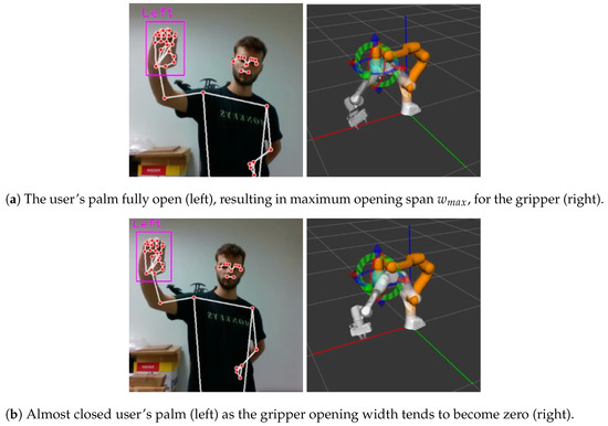 It was observed that when the palm was widely open, or the actual distance between the human fingers tended towards zero, depth estimation became inaccurate due to the stereo depth module’s inability to estimate the depth of small surfaces such as fingertips correctly. Because of this, the distance value w calculated by our algorithm became significantly high, reaching approximately 60 m. It was considered that an open palm can not extend 0.5 m. In this way, the gripper opening width was calculated as described in Section 3.6. However, if w values were greater than 0.5 m, the gripper’s opening would be set to zero.