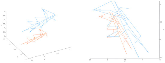 The trajectory of the user’s hand, with respect to the frame of reference c, and the end effector, with respect to b. 33 points are depicted with blue for the human hand and orange for the Panda arm. The left graph is a side-view comparison of the movements, while the right one illustrates the same sequence from a top view.