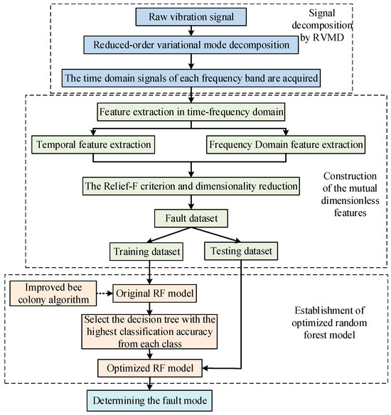 Consequently, an effective fault diagnosis method for rolling bearings is proposed with the combination of RVMD, Relief-F, and optimized RF. The real-time vibration signal of the rolling bearing is processed by RVMD to obtain the decomposition signal of multiple dimensions, and the time–frequency domain features are extracted from the decomposed signals. Then, the Relief-F is used to construct a feature set by selecting several top-ranked features. In addition, an improved artificial bee colony algorithm is proposed based on the simulated crossover binary algorithm, which can adaptively optimize the key parameters and improve the classification accuracy of RF. The main contributions of this study mainly include three aspects: