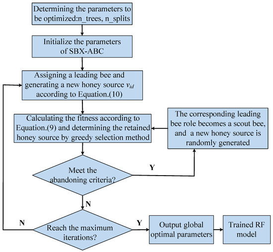 - The number of decision tree n_trees and features n_splits is selected as optimized key parameters, their optimization ranges are determined, and the input of SBX-ABC-RF is the training set.