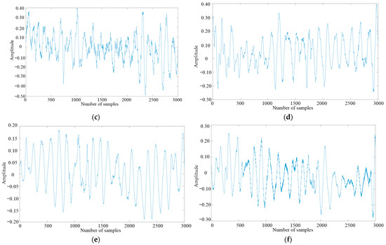 The vibration signals of each condition are decomposed into seven subset signals by RVMD, and the decomposed signals of the rolling cage fault and rolling ball fault are shown in Figure 12. To obtain the multi-scale and rich information features’ useful fault information, the previously defined time–frequency domain features are extracted from each decomposed signals, and we can construct a feature set containing 203 features.