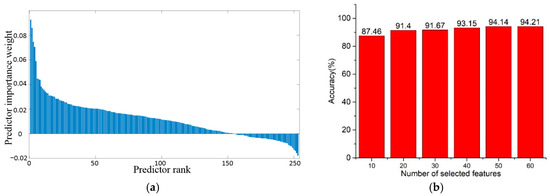 Feature selection results. (a) The weight value of 203 features in case 2, (b) Classification results of different numbers of the features in case 2.