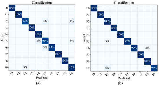 Then, the classified effectiveness of the features is illustrated in Figure 9, and it can be seen that the features have different classification capabilities for different fault modes. Frequency domain feature C20 is extracted from the seventh decomposed signal in the drive end, which can be used to distinguish fault mode F0 from F1 and F6. Time domain feature C29 of the seventh decomposition signal is very useful for the classification of fault modes F0, F1, F4, F8, and F9. The two features are the discriminative features with high weight values for fault diagnosis, which can verify the effectiveness of the Relief-F method.