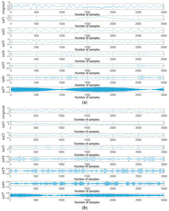 The RVMD decomposition signals in fault modes F1 and F4. (a) Decomposition signals in fault mode F1. (b) Decomposition signals in fault mode F4.