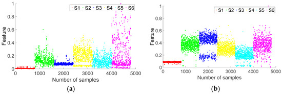 To select the highly discriminative features, the Relief-F is used to evaluate the diagnostic ability of each feature. As shown in Figure 13a, the weight of the 203 features has been sorted from largest to smallest, and the features with the largest weight are selected to identify the fault modes. The different numbers of features are selected as the input of RF and the classification results are shown in Figure 13b. The classification results and computational complexity are considered comprehensively, and the top 40 features are selected to form a new feature set and are applied for model training. The classification effectiveness of the extracted features for different fault modes is illustrated in Figure 14. The frequency domain feature C26 is extracted from the seventh decomposed signal, the time domain feature C1 is obtained from the sixth decomposed signal, and the two features can be used to distinguish fault mode S0 from the other fault modes, which have high weight values assigned by Relief-F.