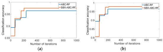 The optimized performance of the improved artificial bee colony algorithm is shown in Figure 10. It can be seen that the proposed method has a higher classification accuracy than the artificial bee colony algorithm optimized random forest (ABC-RF) model. The iterative speed of the ABC is almost the same as that of the SBX-ABC, but the SBX-ABC is easier to find the global optimal solution and avoid falling into the local optimal solution. The confusion matrix on the test set in case 1 is shown in Figure 11. As shown in Figure 11a, the classification accuracy of ABC-RF in case 2 is 95.49%, though the ABC-RF method has good classification results, but it has a poor performance in fault mode S3 and S6. The classification results of the proposed method in Case 2 is shown in Figure 11b, the classification performance in fault mode S3 and S6 has been improved, and the overall classification accuracy reaches 97.85%. Therefore, SBX-ABC has a better optimization ability to find the optimal key parameters, and most fault samples are accurately identified by optimized RF.