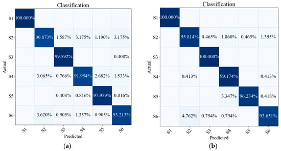The optimized performance of the SBX-ABC algorithm is illustrated in Figure 15. It can be seen that SBX-ABC has a better performance in finding the optimal solutions, and the classification accuracy with the 50 population size is lower than that when the population size is 100. However, when the population size is 100, the optimized time is too long, but the classification accuracy does not increase significantly, so the population size is set to 70 in case 2. The confusion matrixes on the test set in case 2 are shown in Figure 16. As shown in Figure 16a, the classification accuracy of ABC-RF in case 2 is 95.49%, although the ABC-RF method has good classification results in fault mode S1 and S3, and it has a poor performance in fault mode S2, S4, and S6 in which the accuracy is below 93%. The classification results of the proposed method in case 2 are shown in Figure 16b. The classification performance in fault mode S2, S4, and S6 has been improved and the overall classification accuracy reaches 97.85%. Therefore, the proposed method can effectively extract the fault features and accurately identify fault modes.