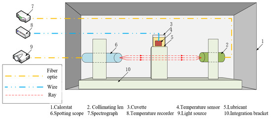 To study the optical properties of the lubricant at different temperatures, this paper uses a spectrometer to measure the visible light spectrum of the lubricant across various temperature ranges. Figure 1 shows a schematic of the optical property testing setup. The experiment utilizes a ML005 constant temperature chamber from Jianheng Instruments to regulate and maintain the lubricant’s temperature. To ensure accurate optical measurements, a cuvette is used to hold the lubricant. The temperature of the oil is monitored in real-time using a K-type temperature sensor and the EX4000 series multi-channel temperature acquisition system. An HDL halogen cold light source is employed, with light transmitted through optical fibers to the cuvette. A collimating lens then collects the transmitted light that passes through the oil. Finally, the transmitted light is directed through optical fibers to the Ocean Optics USB4000 spectrometer for analysis. The relevant instrument parameters are provided in Table 2. The testing stand, cuvette, temperature sensor, light source fiber box, and collimating lens are positioned inside the constant temperature chamber, while the temperature monitoring system, light source, and spectrometer are located outside the chamber.
