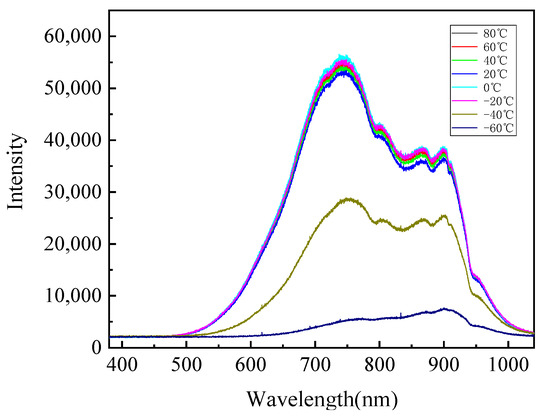 Following the steps outlined above, this study measured the transmission spectra of air and cuvette, as well as the transmission spectra of a specific heavy-duty power transmission lubricant, over a temperature range of −70 °C to 80 °C, with wavelengths spanning 380 nm to 1040 nm. The transmission spectra of the air and cuvette are shown in Figure 4, while the transmission spectra of the lubricant at various temperatures (80 °C, 60 °C, 40 °C, 20 °C, 0 °C, −20 °C, −40 °C, and −60 °C) are presented in Figure 5. From the figures, it is clear that as the temperature decreases, the relative light intensity in the transmission spectra generally decreases. However, between 80 °C and −20 °C, the relative light intensity across the 380 nm to 1040 nm wavelength range remains almost unchanged. When the temperature drops from −20 °C to −40 °C, the relative light intensity in this range decreases sharply, indicating that the transmissibility of the lubricant significantly reduces within this temperature range. From −40 °C to −60 °C, the decrease in the relative light intensity is less pronounced than from −20 °C to −40 °C, but the downward trend is still observable. Figure 5 also shows that the light source used in this study has peaks at wavelengths around 750 nm and 900 nm and a valley at around 830 nm. The transmission patterns at these wavelengths vary with the temperature. Above −20 °C, the transmission at 750 nm is the highest, but between −20 °C and −40 °C, it experiences the greatest decrease. In contrast, the transmission at 900 nm is the lowest above −20 °C, but despite a sharp drop in transmittance between −20 °C and −40 °C, it still maintains a relatively high light intensity.