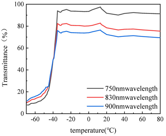 As shown in Figure 6, the relationship curves between the transmission rate of the lubricant and temperature at wavelengths of 750 nm, 830 nm, and 900 nm were derived from the data in Figure 4 and Figure 5. These curves clearly illustrate the connection between the temperature, transmission rate, and wavelength. Overall, when the temperature is above −35 °C, the transmission rate decreases as the wavelength increases. However, when the temperature drops below −42 °C, the transmission rate increases as the wavelength increases. In the temperature range from −35 °C to 80 °C, the transmission rate exhibits slight fluctuations with the decreasing temperature, following a pattern of decrease–increase–decrease. The maximum transmission rate for each wavelength occurs near 15 °C. In the temperature range from −35 °C to −42 °C, the transmission rate decreases sharply across all wavelengths. For instance, at 750 nm, the transmission rate decreases from 93.94% at −35 °C to 35.37% at −42 °C, a reduction of 62.34%, with a rate of decline of 8.36%/°C. Between −42 °C and −70 °C, the transmission rate continues to decrease, but the rate of decline slows down. For example, the rate of change in transmission at 750 nm drops from 5.46%/°C between −42 °C and −43 °C to just 0.11%/°C between −69 °C and −70 °C. These observations indicate that at different temperatures, the transmission rates of the lubricant at various wavelengths behave differently, and the trends of these variations are not the same. This means that if a light beam with an identical intensity and spectrum passes through a lubricant with different internal temperature distributions (while the optical path remains the same), it will produce distinct transmission spectra. By establishing a relationship between the transmission spectrum and temperature distribution, the internal temperature distribution of the lubricant can be inferred from the measured transmission spectra. This non-contact method of continuously measuring the internal temperature of molten liquids offers significant advantages. It avoids the spatial discontinuities and potential disruptions caused by temperature sensors, and it also overcomes the limitations of infrared thermography, which struggles to provide accurate thermal imaging at low temperatures.