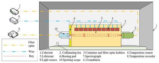 In modern mechanical systems, lubricating oil plays a pivotal role as a key material [1,2,3,4,5,6,7,8], directly influencing the operational efficiency, service life, and overall reliability of machinery. This is especially critical in high-performance systems such as engines, where the precise monitoring of the temperature distribution of lubricating oil is essential for optimizing the lubrication effectiveness and enhancing the energy utilization efficiency. The accurate regulation of the lubricating oil temperature is vital for the formation and optimal performance of the lubricating film within the oil [9]. However, conventional temperature sensors, including thermocouples and infrared thermometers, exhibit significant limitations. These include slow response times, inadequate spatial resolution, and the inability to function reliably under high-temperature and high-pressure conditions. Consequently, these sensors are incapable of providing the precise, real-time monitoring of the temperature distribution of lubricating oil in complex flow environments.