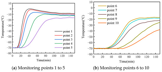 Following the procedure outlined above, transmission spectra of a specific heavy-duty power transmission lubricant in the wavelength range of 380 nm to 1040 nm, along with temperatures measured at 10 monitoring points, were recorded at 2 min intervals over a period of 150 min. Figure 10 presents the temperature–time variation curves for the monitoring points. The data show that the temperature at these points generally increases rapidly at first, followed by a slower rise. For monitoring points 1 to 4, which are closer to the heating plate, a slight temperature drop is observed after the initial rapid increase. This drop is caused by heat loss as the molten fluid comes into contact with the air. As heating continues, the temperature curve gradually flattens, indicating that the lubricant is approaching thermal equilibrium due to the combined effects of the external low-temperature environment and the heating plate. For monitoring points 6 to 10, which are farther from the heating plate, the temperature shows minimal fluctuation in the early stages of melting. This is because the solidified lubricant in this region primarily relies on heat transfer through conduction between the solid particles. Since the thermal conductivity of the solidified lubricant is much lower than that of its liquid state, heat transfer in the solid phase is slower than the convection heat transfer in the liquid phase. Consequently, the temperature in these regions rises more slowly, showing a clear time delay. As heating continues, heat gradually transfers to these areas, and the temperature rise accelerates.
