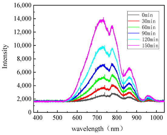 The transmission spectra at 0, 30, 60, 90, 120, and 150 min are shown in Figure 11. From the figure, it is evident that the transmission spectra change noticeably over time as heating progresses. Similar to the temperature changes at the monitoring points, the relative light intensity in the spectra remains relatively stable during the first 30 min of heating. However, between 30 and 150 min, as the temperature inside the lubricant rises, more areas of the oil reach temperatures above −37 °C. This significantly improves the oil’s transmissibility, leading to an increase in the relative light intensity recorded by the spectrometer. The changes in the relative light intensity at different wavelengths follow distinct patterns. During the first 30 min, the temperature of the lubricant along most of the light path remains below −42 °C, which results in a lower transmission at 750 nm and a corresponding decrease in the peak near 750 nm in the spectrum. As heating continues, the region where the temperature exceeds −37 °C gradually expands, improving the transmissibility of shorter wavelengths. This causes the peak near 750 nm to increase sharply, with the rise being notably faster than at other wavelengths.