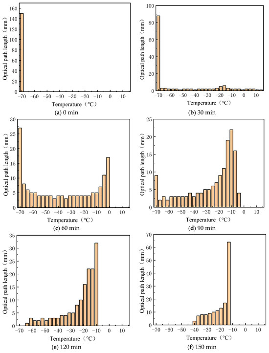 Based on the transmission spectra of a specific heavy-duty power transmission lubricant at different temperatures within the 380 nm to 1040 nm wavelength range (as shown in Figure 6), a temperature step of , a wavelength step of , and an optical path length of were used. By segmenting the transmission spectrum and applying the relevant data to Equation (7), the optical path determinant at each temperature for each time point was calculated. Solving this determinant provided the optical distance distribution at different temperatures over time. The histograms of the optical distance distribution at 0, 30, 60, 90, 120, 150, and 180 min are shown in Figure 12. From the figure, it is evident that the temperature distribution follows a U-shaped trend. In the initial stages of heating, most of the optical path is at lower temperatures. As heating continues, the low-temperature region decreases in size, and the temperature distribution shifts to a pattern where the ends are warmer and the middle is cooler. In the later stages of heating, this trend reverses: the high-temperature region expands and the size of the low-temperature region decreases as the temperature continues to rise.