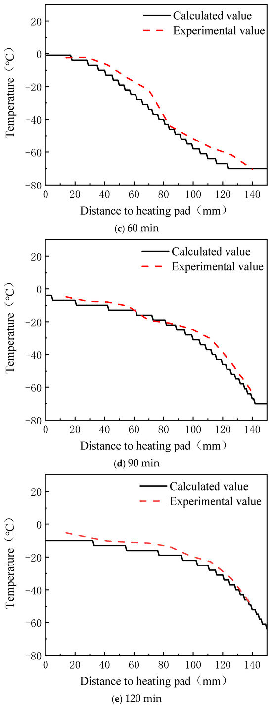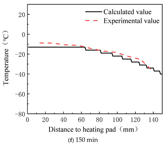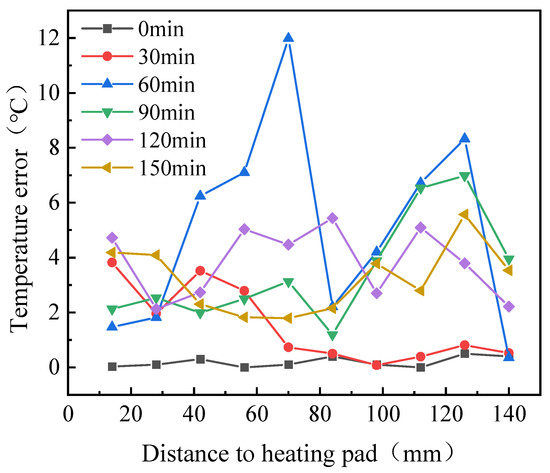 The melting process of the lubricant in a low-temperature environment, as studied in this paper, follows unidirectional melting, resulting in a temperature distribution that either monotonically increases or decreases. The temperature distribution curve derived from the optical distance data in Figure 12 is compared with the temperature distribution measured by sensors, as shown in Figure 13. The error between the calculated and experimental values is presented in Figure 14. From these figures, it is evident that the temperature distribution trend calculated by the proposed method closely matches the trend observed experimentally throughout the heating process. In the initial heating phase, the error between the calculated and experimental values is small, with an average error of 0.22 °C and a maximum error of only 0.50 °C across all ten monitoring points. As heating continues, the error gradually increases, reaching its peak at 60 min, with an average error of 5.67 °C and a maximum error of 11.98 °C. After this point, the error stabilizes and the average errors at 90, 120, and 150 min are 3.80 °C, 3.97 °C, and 3.41 °C, respectively, while the maximum errors are 6.98 °C, 5.43 °C, and 5.56 °C, respectively. The larger error at 60 min may be attributed to the rapid temperature rise and significant temperature gradient at that time. The temperature range step (∆T) is more sensitive to changes in the optical distance, which amplifies the impact of measurement errors on the accuracy of the equation solution. This results in greater discrepancies between the calculated and experimental values.