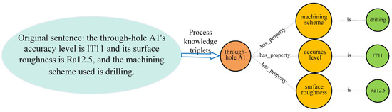 This paper utilizes the natural language processing toolkit, pyltp, and interacts with it through the Python (Version 3.9.5) programming language under the Visual Studio 2019 compilation environment. The processing of crafted text involves several steps. First, the original text undergoes clause-splitting and word-splitting, and the resulting vocabulary is labeled according to the notation provided in pyltp. The dependency syntax analysis is then performed, focusing on words with subject–verb (SBV) and verb–object (VOB) relationships. The commonly used table for dependency syntax relationships is as shown in Table 6. Finally, semantic role annotation is performed to label words with SBV, VOB, and ATT relations. This process extracts the subject and object in subject–predicate and verb–object relations, forming the elements of entities, relations, attributes, and values. After this process, the process knowledge graph is formed, as shown in the example in Figure 1.