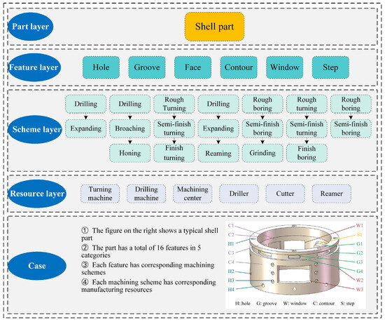 This section describes the formation of a process knowledge graph using a combination of top-down and bottom-up approaches [18]. The process knowledge ontology is structured as a tree, with top-layer concepts serving as root nodes and progressively detailed leaf nodes. Inter-layer relationships are depicted as branches. The upper-layer conceptual model for the process domain is developed top-down, creating the ontology model for parts, features, machining schemes, and manufacturing resources (Figure 2). The schema layer is built by mapping knowledge concepts.