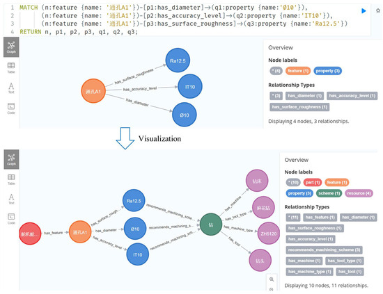 Based on each feature’s manufacturing parameters, available machining solutions are retrieved through a process knowledge graph. Take the retrieval of “through hole A1” as an example; the retrieval process is shown in Figure 7. By entering the three constraints of diameter, accuracy class, and surface roughness, the “through hole A1” feature can be matched. Then, by clicking on the visualization, we call the information related to “through-hole A1”, where we can retrieve a recommended machining scheme for “through-hole A1” under the conditions shown in Figure 7.