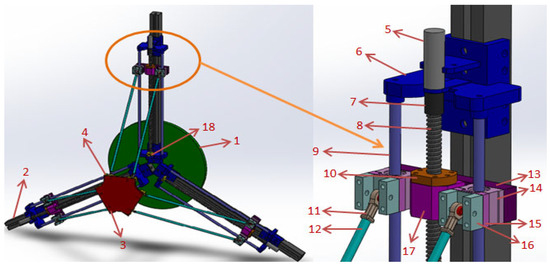 While designing the robot, the dimensions of elements 2, 8, 9, and 12 of the three-dimensional design of the parallel robot shown in Figure 2 were decided, in order to provide movement in the desired working space.