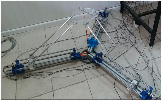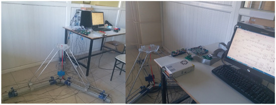 After the completion of the design process, the production of the 3-DOF parallel robot was started. Firstly, the parts numbered 4, 5, 7, 10, 11, 14, and 17, whose dimensions were determined, were supplied. Afterward, the parts numbered 3, 13, 15, and 16, which were to be produced using plexiglass material in the three-dimensional CNC machine, were saved and produced as the dxf file extension. Some parts needed were produced from PLA material by a 3D printer. The parts of the ball screw, linear shaft, and parallelogram bars were machined on the lathe and made ready for the desired suitable dimensions. Both ends of the ball screws to be used were machined on the lathe to reduce the diameters suitable for the end bearing and coupling. In order to ensure proper bolt connections, both ends of the linear shafts were threaded with the help of a tap. Similarly, both ends of the parallelogram rods were threaded to provide spherical joint connections. After all the parts needed in the production phase were finalized, the assembly process was started. In the first stage, three fixed aluminum profiles were mounted to the fixed part holder, which forms the bottom base of the 3-DOF parallel robot, with appropriate bolt connections. In the next stage, the ball screw and end-bearing connections of each arm of the parallel robot were made. For a part designed to provide motor, coupling, and ball screw connections, PLA material was produced on a three-dimensional printer. Similarly, in order to ensure the bearing on the ball screws, a special part to fix the bearing elements was designed and produced on a three-dimensional printer. In the last stage, the connections between the joints of the gripper end of the parallel robot and the joints of the sliding elements on the ball screw were terminated using parallelogram bars. In order to prevent slipping, fiber nuts were used for better fixation in the connections. Thus, the production process of the 3-DOF parallel robot was finalized. Figure 3 shows an image of the fabrication of the linear parallel robot. The brands and models of the motors, gearboxes, and encoders used in the linear parallel robot system shown in Figure 3 are Maxon DCX22L, Maxon GPX22, and Maxon ENX16, respectively. The Maxon GPX22 is added to the front of the DC motor (Maxon DCX22L) to increase the amount of torque. Similarly, Maxon ENX16 is mounted on the back of the DC motor and selected to read the rotation of the motor instantaneously and transfer it to the interface program with the encoder blocks of the board in Matlab/Simulink R2017b via Humusoft MF634 data acquisition card (Humusoft s.r.o. Company, Prague, Czech Repuclic). Figure 4 shows the experimental setup of the robot, the hardware used, the hardware connection cables, and the computer interface.