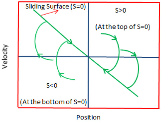 The sliding surface given in Figure 5 is defined by Equation (2). It consists of error and derivative of error variables. During runtime, S is positive if the state is above S = 0. Therefore, must be negative so that the state variables are forced towards the sliding surface S = 0. When the state is below S = 0, S is negative. Therefore, must be positive so that the state variables are forced towards the sliding surface (S = 0). For this reason, the following inequality exists in both cases [35].