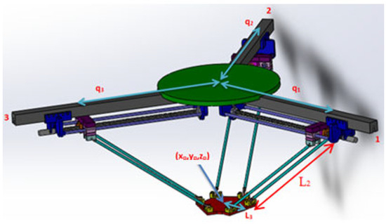 The internal logic of the interface software is as follows. First, reference points are established for the robot’s end effector. Once the program is complete, the distances of each motor with the identifiers q1, q2, and q3 are determined using inverse kinematic equations. To give these values, the encoders provide feedback and the motors are activated. The difference between the reference values and the input feedback is sent to the sliding mode controls. The PWM signals required by motors are produced in this way. When the relevant reference levels are attained, the robot stops completely. The reference values employed in this inquiry are x = −170 mm, y = −175 mm, and z = 540 mm, as shown in Figure 7 and Figure 8.