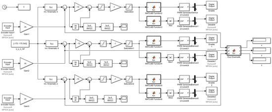 The forward kinematic equations of the robot, which are obtained depending on the fixed limbs of the robot, q1, q2, and q3, using the inverse kinematic equations of the robot, are given below. These inverse and forward kinematic equations were used during the control of the robot to convert the robot gripper tip reference values into horizontal motion and to translate the realized horizontal motion into robot gripper tip coordinates. The block diagrams of the SMC and MSMC implemented in Matlab/Simulink R2017b real-time toolbox environment using these equations are given in Figure 7 and Figure 8.
