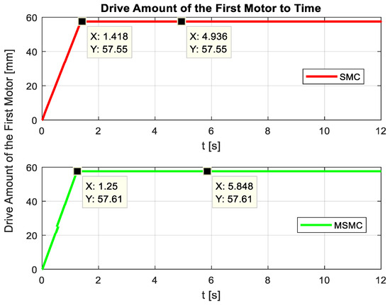 The SMC method was applied on the first motor by determining the distance that the part on the ball screw should cover by rotating the motor with the help of the inverse kinematic equations of the robot according to the reference values x = −170 mm, y = −175 mm, and z = 540 mm. These reference values represent one of the far distance points in the robot’s workspace. In Figure 9, the drive amount of the first motor (q1) to meet the determined references are presented together in order to compare the results obtained with SMC and MSMC methods. “Drive amount of the first motor” refers to the progression of the elements on the ball screw driven by the first motor. In other words, the distance moving on the ball screw given in Figure 6 is equivalent to q1. In the naming of Figure 9, q1 is expressed in brackets. As a result of the analyses, it was observed that while the feed rate of the first motor reached 57.55 in 1.418 s in the SMC method, this value reached 57.61 in 1.25 s in the MSMC method. Accordingly, it is determined that the MSMC method provides the targeted feed amount of the first motor on the ball screw in a shorter time compared to SMC.