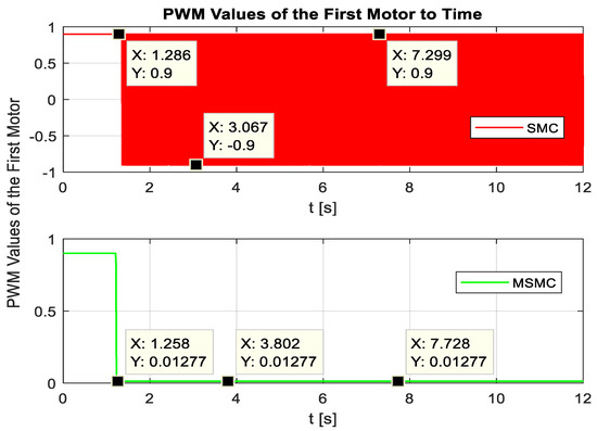 For SMC and MSMC control, Figure 10 displays the PWM signals given to the first motor in order to produce the intended reference value (q1) on the ball screw. The graphs show that the PWM signal in the SMC approach continuously varies between 0.9 and −0.9. The so-called chattering in the motor was brought on by this circumstance. The PWM signal in the MSMC technique is known to be fixed at 0.01277, which is between 1.258 s and nearly zero. The findings show that the MSMC approach takes less time and produces the desired reference value more silently.