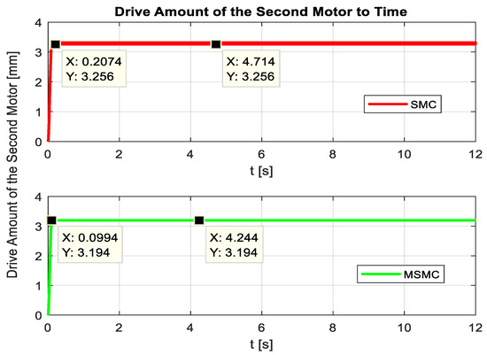 In the second motor, SMC is used, which involves the calculation of how much the motor should move for the distance (q2) to be reached on the ball screw according to the given reference values. Figure 11 shows the result graphs of SMC and MSMC control for the second motor to provide the progress (q2) on the ball screw. How much progress the second motor will provide is calculated with the help of the inverse kinematic equations of the robot using the reference values desired to be traveled by the end effector of the robot. It is understood from the graphs that the progress value on the second screw shaft of 3.256 mm is reached in 0.2074 s in the SMC method, and the progress value on the second screw shaft of 3.194 mm is reached in 0.0994 s in the MSMC method. From these results, it is observed that a more successful result is obtained in the MSMC method, and the desired value is achieved earlier in the MSMC method.