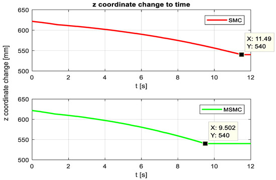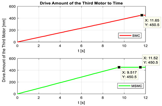 In order to obtain the appropriate displacement on the third ball screw according to the reference values given for the end effector of the robot, SMC methods were also applied to the third motor in order to provide the value (q3) calculated from the inverse kinematic equations of the robot. Figure 13 presents the graphs of the drive amount (q3) on the ball screw shaft with respect to time as a result of the operation of the third motor. In the graphs, the results obtained after applying the SMC method and MSMC method are given together. While 450.5 mm feed value was reached in 11.65 s in the SMC method, this feed value was reached in 11.52 s in the MSMC method. When the results are analyzed, it is obvious that the desired feed rate is reached 0.13 s earlier with the MSMC method.