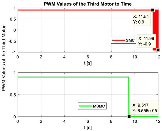 Figure 14 illustrates the PWM signals applied to the third motor while achieving the desired movement on the third screw shaft. The PWM signals for the SMC and MSMC methods are presented separately. When examining the PWM signals, it is observed that the signal for the SMC method oscillates between ±0.9 from 11.54 s onwards. In contrast, for the MSMC method, the control PWM signal reaches a value of 0.00006555 after 9.517 s and stabilizes. As evident from the SMC signal, a more oscillatory behavior, characterized by vibrations and noise, is present. Consequently, the motor experiences chattering and is unnecessarily strained. On the other hand, the MSMC method achieves the desired steady, vibration-free, and noise-free state in a shorter time, thereby preventing undue stress on the motor.