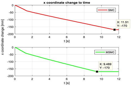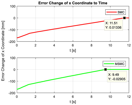 Figure 15 shows the results of SMC and MSMC together for x reference value −170 mm. When the results are analyzed, it is seen that the SMC method reaches the reference value x in 11.51 s. In the MSMC method, it is understood that it reaches the x value in 9.489 s. As can be seen from the graph in Figure 16, the error amount in the SMC method is 0.01336. In the MSMC method, the error amount was obtained as 0.02905. While the percentage relative error is 0.0079 in the SMC method, it is calculated as 0.0171 in the MSMC method. As can be seen from the results, the SMC method reaches the reference value x with a smaller margin of error but has a delay of 2.021 s. Considering that the margins of error are quite small in both cases, the importance of the reaching time increases. For this reason, it can be said that MSMC provides better control since it reaches the reference value earlier with a time difference of 2.021 s.