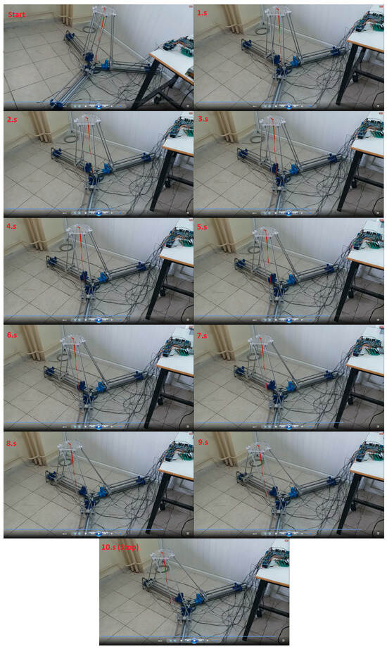 Figure 21 shows the changes in the robot motion at one second intervals of the position control application performed on the robot as shown in Video Supplementary. At the end of about 10 s, the progress of the robot on each ball screw (q1, q2, and q3) is seen to provide the desired reference value from the initial position.