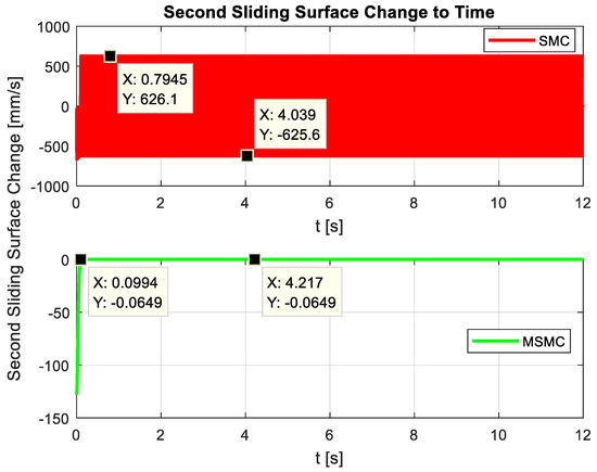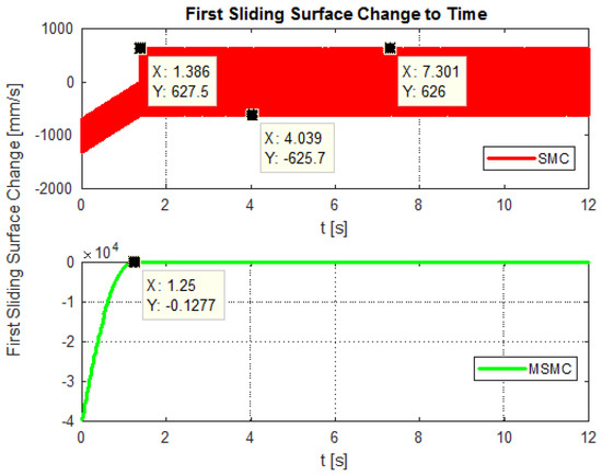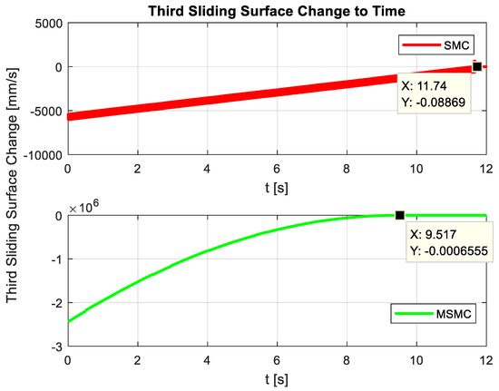 Figure 22, Figure 23 and Figure 24 show the sliding surfaces of the SMC and MSMC methods applied to each engine, respectively. From the graph in Figure 22, it is seen that the sliding surface of the SMC method is not fixed and constantly shifts between ±626 values, while the sliding surface of the MSMC method remains at a constant value. There is a similar situation in Figure 23. While the SMC method fluctuates at the same values, the sliding surface value of the MSMC method remains at a constant value. In the control of the last motor, the sliding surfaces stabilized at the end of 11.74 s for the SMC method and 9.517 s for the MSMC method.