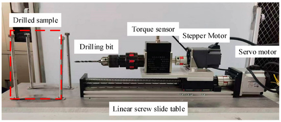 As shown in Figure 1, the micro-drilling test system is mainly composed of a drilling device, a sensing device, and a control device. The drilling device mainly includes a twist drill bit (diameter 8 mm), a rotary stepper motor, and a propulsion servo motor. The stepper motor provides the rotary drilling power of the bit, and its rated speed is 3000 r/min and rated torque is 0.8 N·m. The servo motor provides the bit propulsion power by connecting the lead screw, and its rated output torque can reach 2.4 N·m. The constant torque output of the servo motor is set in the drilling process of this test to simulate the drilling process of the drilling machine in a coal mine at constant bit weight. The drilling pressure can be obtained by the following equation: