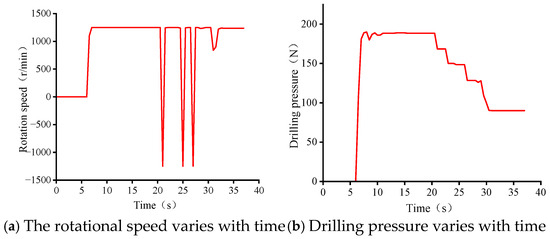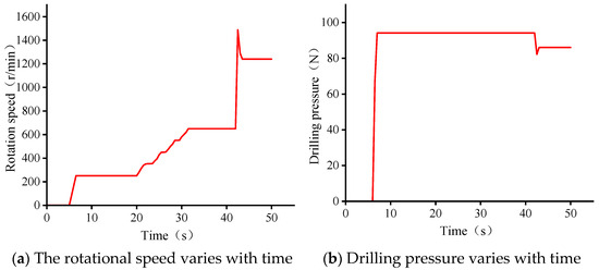 Multiple groups of experiments were carried out on the experimental bench, and the data in the experiment process were collected, including torque, drilling rate, rotational speed, propulsion pressure, etc., which was convenient for analyzing the influence of various parameters on the drilling process and providing data for the intelligent algorithm model. The 50 groups of drilling control parameters tested on the micro-drilling test bench are shown in Table 3, and each group is controlled by constant drilling pressure and constant rotational speed.