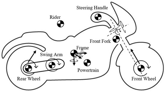 The model contains eight lumped masses (the rider, frame, powertrain, steering handle, front fork, swing arm, front wheel, and rear wheel) in which the rider and powertrain are rigidly connected to the frame.