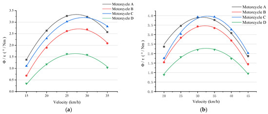 Figure 6 shows experimental data for four motorcycles. It can be observed that there was a trend similar to that of the simulation’s data, but there was a certain gap in amplitude and phase.