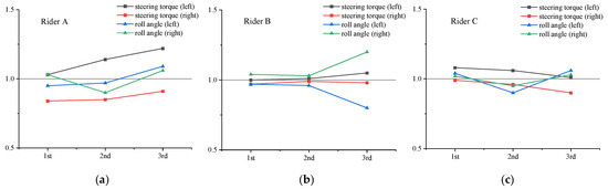 Normalized values of steering torque and roll angle: (a) Rider A; (b) Rider B; and (c) Rider C.