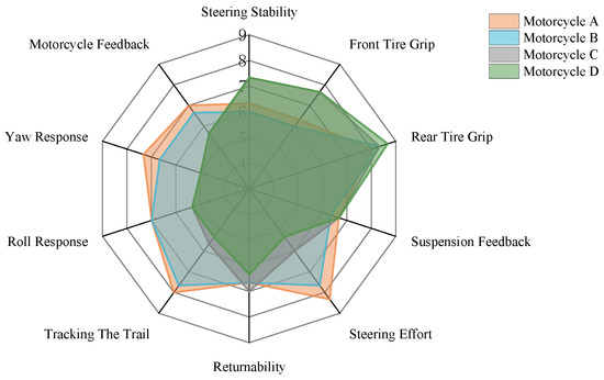 Intuitively, motorcycle A had the highest evaluation in indexes that reflect handling performance, and motorcycle D had the highest evaluation in indexes that reflect stability.