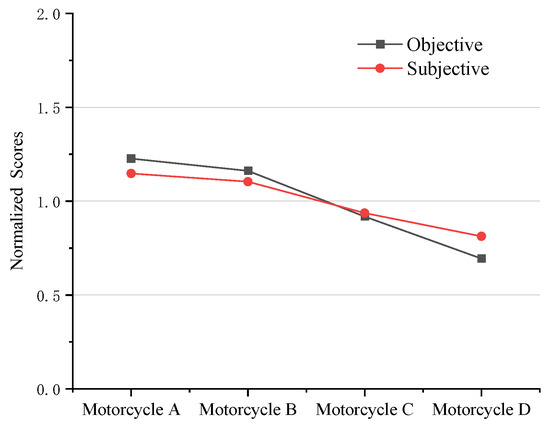 Based on the subjective evaluation score and index weight coefficient, the final subjective evaluation scores of four motorcycles were normalized, and then compared with the normalized values of objective indicators, as shown in Figure 9.