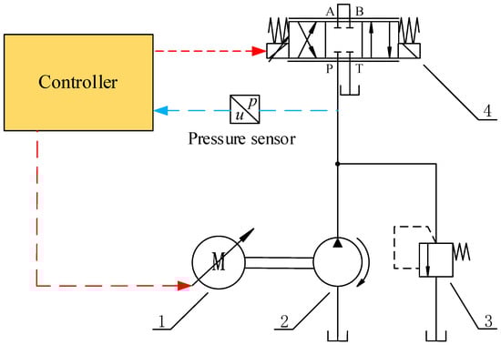 System architecture diagram. The red line represents the control line, the blue line represents the signal feedback line, and the black line represents the oil circuit of the hydraulic system itself.