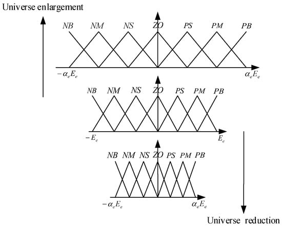 The variable universe fuzzy PID control is a novel approach that combines the concept of variable universes with fuzzy PID control [25,26]. The universe of discourse is adjusted in real time according to changes in the input. The corresponding rules are as follows: when the error is large, the adaptive scaling factor enlarges the fuzzy universe, thereby extending the associated membership functions and reducing the redundancy of fuzzy rules. Conversely, when the error is small, the fuzzy universe is reduced, and the associated membership functions are compressed, effectively increasing the number of fuzzy rules, as illustrated in Figure 3. This mechanism helps to prevent system oscillations and poor disturbance rejection caused by input variations, thereby ensuring system stability.