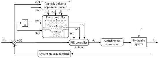In summary, although some scholars have made breakthroughs in developing controllers to reduce system pressure shocks, their efforts have primarily focused on valve control strategies that directly manage system pressure without further consideration of unknown disturbances’ impacts on the system. Additionally, there has been limited research on pump-controlled system pressure, particularly regarding variable domain fuzzy PID control algorithms for servo motors. Electro-hydraulic power sources can provide the necessary pressure and flow for hydraulic systems [21]. Due to the higher control precision and broader power control range of servo motors compared to variable frequency asynchronous motors, they can reduce system energy consumption and adapt to load changes [22]. Therefore, this study proposes controlling the pump motor speed to regulate system pressure and introduces a variable domain fuzzy PID controller for the servo motor speed to enhance system responsiveness and anti-disturbance performance.