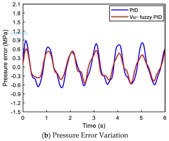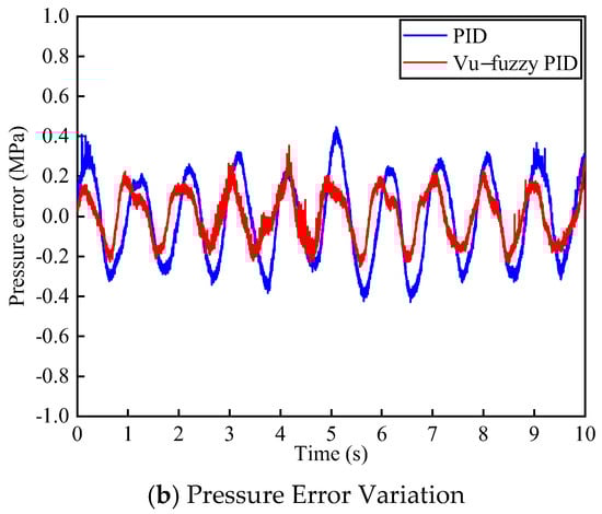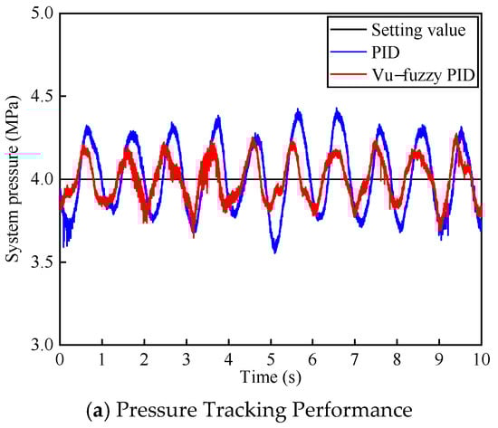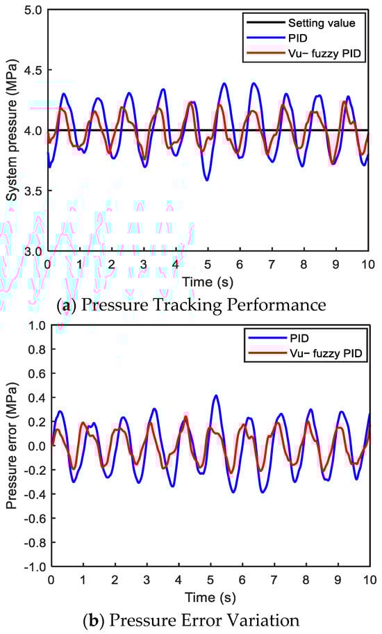 The system pressure was set to 4 MPa, with the voltage value of the three-position four-way proportional directional valve set to 3.4 ± 0.1 V and a frequency of 1 Hz. The system pressure performance under the two control algorithms is shown in Figure 10. From Figure 10a, it can be observed that although both controllers maintain the system pressure around 4 MPa, the pressure fluctuation of the proposed algorithm is smaller compared to PID control. As shown in Figure 10b, the proposed method reduces the pressure tracking error by approximately 36.5%.