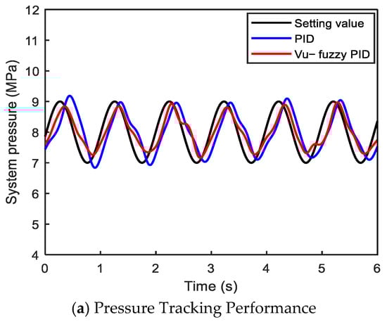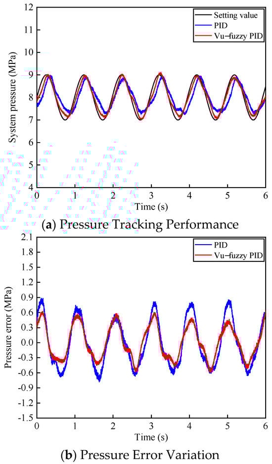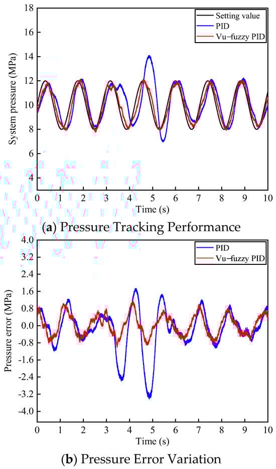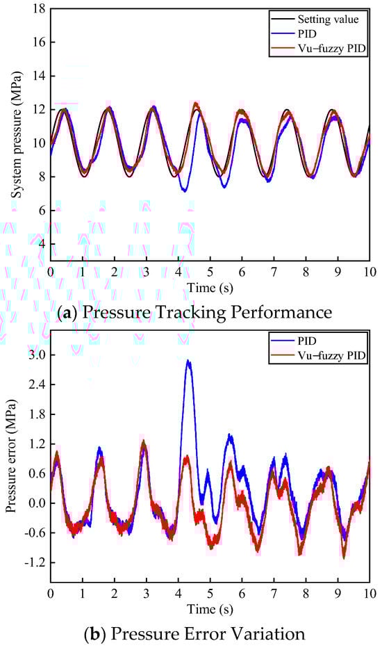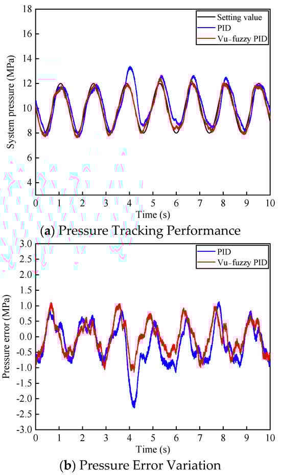 Under the same sinusoidal input signal of 10 ± 2 MPa with a frequency of 0.7 Hz for the system pressure, the voltage of the three-position four-way proportional directional valve was initially set to 3.3 ± 0.1 V with a frequency of 1.5 Hz. After 4 s, the voltage was adjusted to 3.5 ± 0.1 V while maintaining the same frequency of 1.5 Hz. The system pressure tracking performance is shown in Figure 14. From Figure 14a, it can be observed that during the first 4 s, both control algorithms exhibit similar tracking performance for the sinusoidal pressure signal. However, after increasing the voltage bias of the proportional directional valve, PID control shows a significant overshoot of approximately 3 MPa, taking 2.2 s to stabilize, while the proposed algorithm exhibits only minor pressure fluctuations.